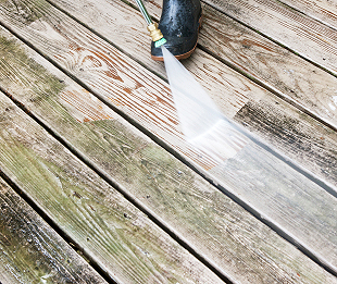 QUESTION: I have a composite deck, light gray in color, and, even though I clean it two times a year with a power washer, there still is this light green mold that appears under the railing and on the steps.