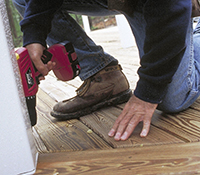 THE FLOORING AND 4-by-4 RAIL POSTS are attached. On a wide deck, decking boards of varying lengths are used instead of a single length, to avoid having a seam down the middle.